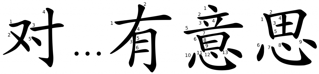 對…有意思/对…有意思 [duì…yǒuyì.sī] VP to be interested in sb. 我覺得他對我有意思/我觉得他对我有意思。I think he’s interested in me.
