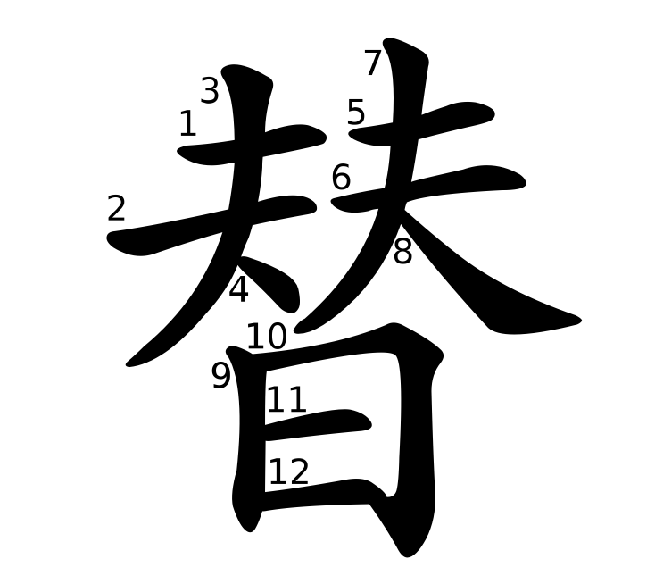 替 [tì] V. take the place of. 你休息吧,我替你做。Take a rest, I’ll do it for you.